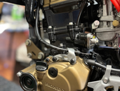 The brake system was upgraded to match the new aggression—oversize rotor, Honda CRF450R dual piston front caliper, Yamaha R7 master cylinder, stainless lines. Lever feel is firm, immediate, confidence-inspiring. You can brake later. Deeper. Harder.